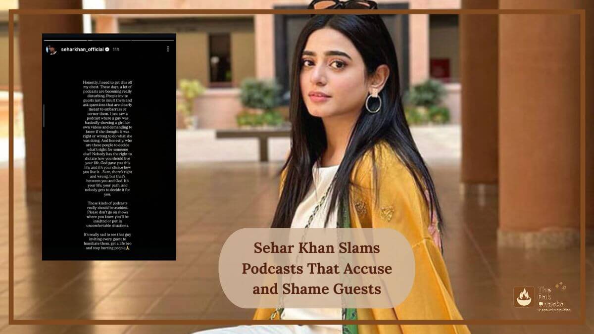 Recently, Pakistani actress Sehar Khan spoke out strongly against a growing trend in the podcasting industry. She called out shows that only bring people on to accuse, shame, or embarrass them. She said the method was rude, upsetting, and useless, and she asked both content creators and viewers to think again about the things they watch. People are talking about ethics, respect, and skill in the media because of what she said.