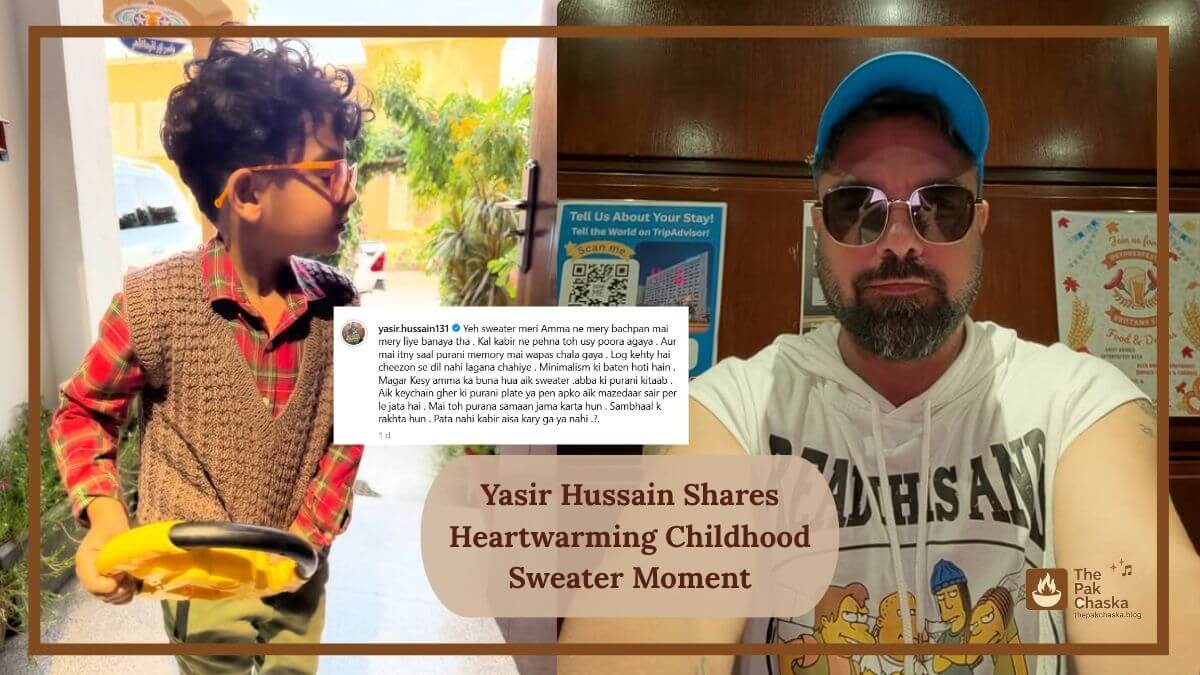 Pakistani star and TV host Yasir Hussain recently melted people’s hearts on social media by posting a picture of his son Kabir wearing his childhood sweater, which made them feel nostalgic. The sweater was a favorite of his from his childhood, and now his son Kabir wears it with love. It gives fans a touching look into parenting, memories, and family bonds.